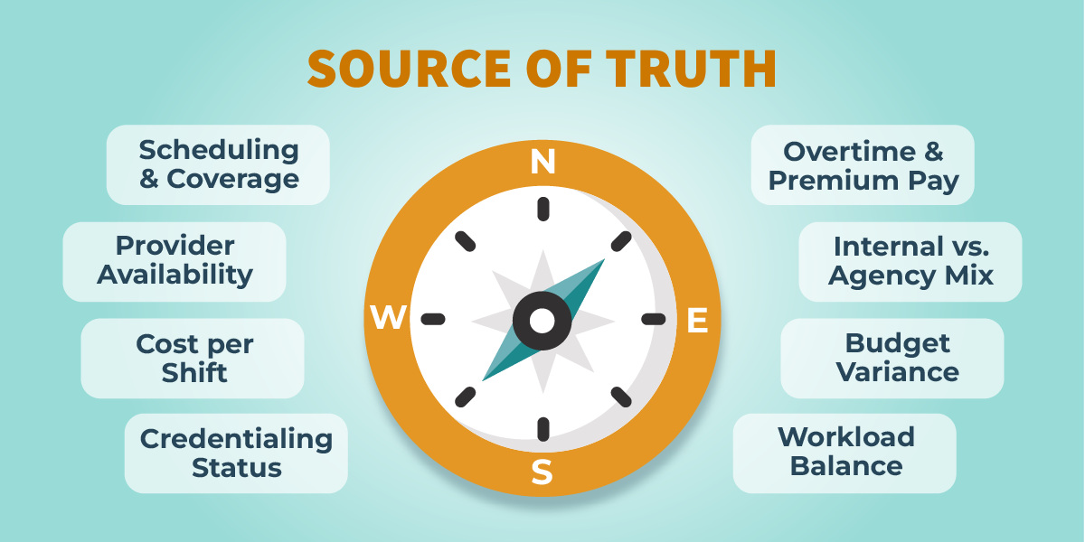 Each system tells part of the story. None of them tell the whole story. So when a decision needs to be made, for example about coverage, spend, overtime, staffing mix, or locum usage, every stakeholder is looking at a slightly different version of reality.
